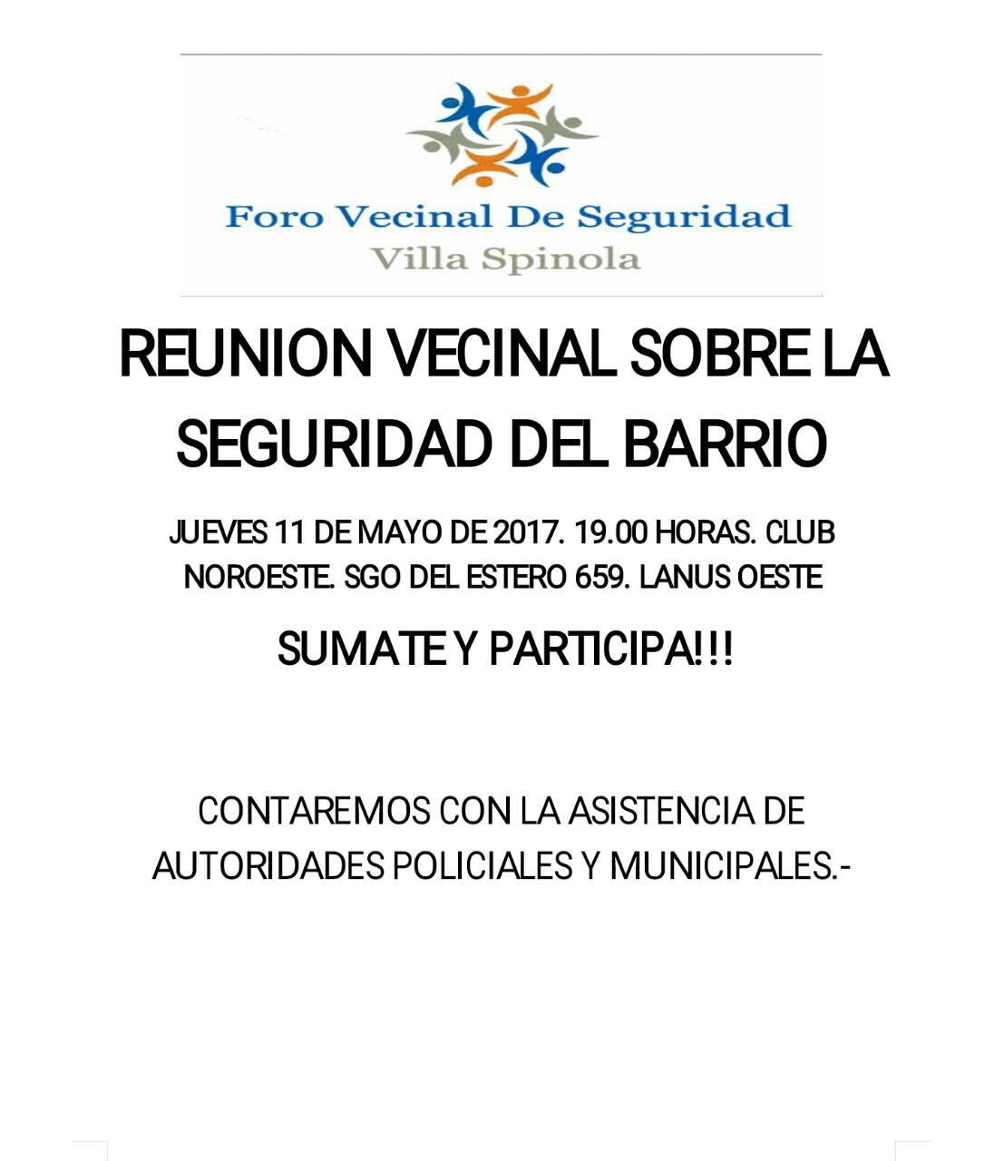 Como lo hace mensualmente, el Foro Vecinal de Seguridad Villa Spínola se reunirá hoy en Lanús Oeste con vecinos y autoridades policiales y políticas, para tratar propuestas para luchas contra ese flagelo.